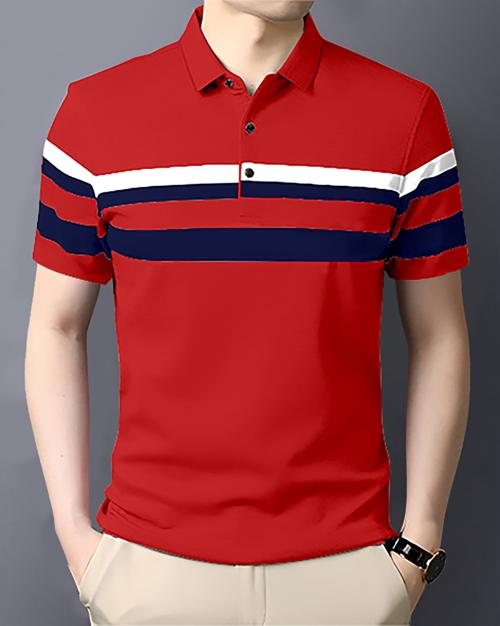 Gespo Red,Navy Blue & White Colorblocked Polo Neck Half Sleeve Casual T-Shirt