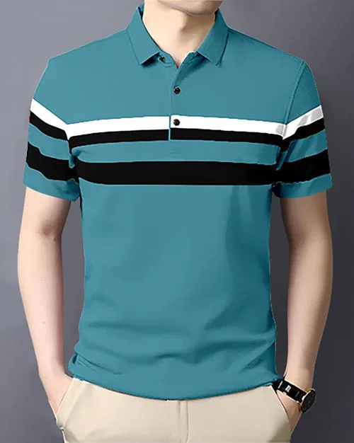 Gespo Teal Blue,Black & White Colorblocked Polo Neck Half Sleeve Casual T-Shirt