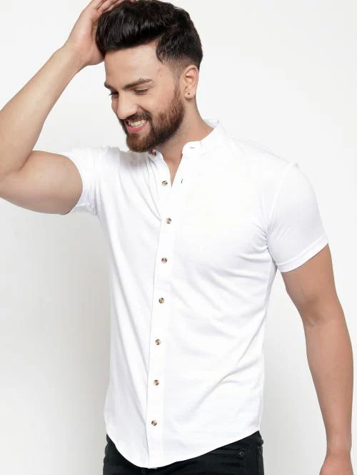 Gespo White Solid Mandarin Collar Half Sleeve Shirt