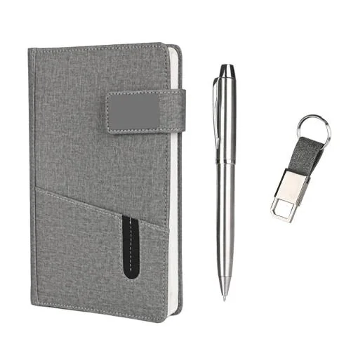 Giftana 3 in 1 Diary with Metal Pen and Keychain Gift Set for Men and Women, Jute Cover Notebook Diary, Metal Keychain and Pen Combo Set for Husband, Corporate Gift Set for Employee Welcome Kit - Grey