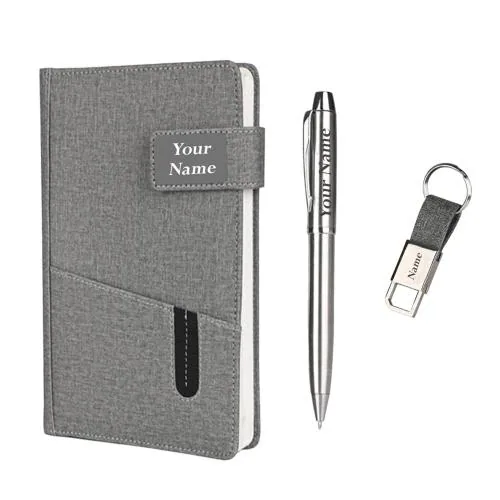 Giftana Personalized Diary with Pen and Metal Keychain Gift Set with Name, Jute Cover Diary, Keychain and Personalised Pen Set for Men and Women, 3 in 1 Personalized Office Gift Set of Business - Grey