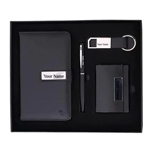 Giftana Personalized Name Pen, Card Holder, Leather Diary and Metal Keychain Gifts Set 4 in 1 Personalized Name Engraved Birthday Gift Set for Men Women Customized Corporate Gift for Employee (Black)