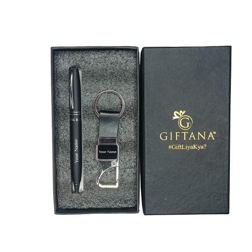 Giftana Personalized Pen and Keychain with Name, Black Leather Opener Key Chain Metal Pen Gift Set for Men and Women, Personalized Birthday Gift for Husband, Customized 2 in 1 Corporate Gift Set