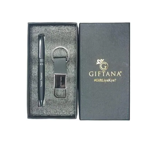 Giftana Personalized Pen And Keychain With Name Engraved, Black Leather Metal Strap Key Chain Pen Gift Set for Men & Women, Personalized Birthday Gift for Husband, Customized 2 in 1 Corporate Gift Set