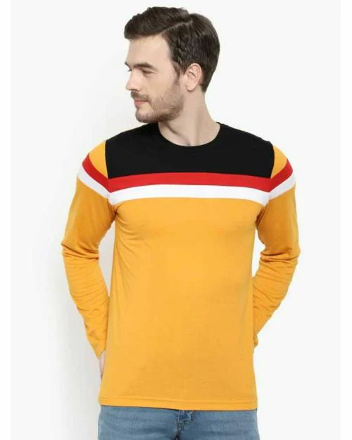 Glito Color Blocked Multicolor Full Sleeves Round Neck T-shirts For Men's