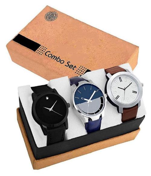 Goldenize Fashion Black Blue Brown Dial Multicolor Strap Leather Analog Watches For Men-Combo Pack of 3