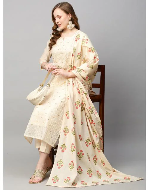 GoSriKi Women Cream Straight Floral Printed Kurta with Trouser & Dupatta