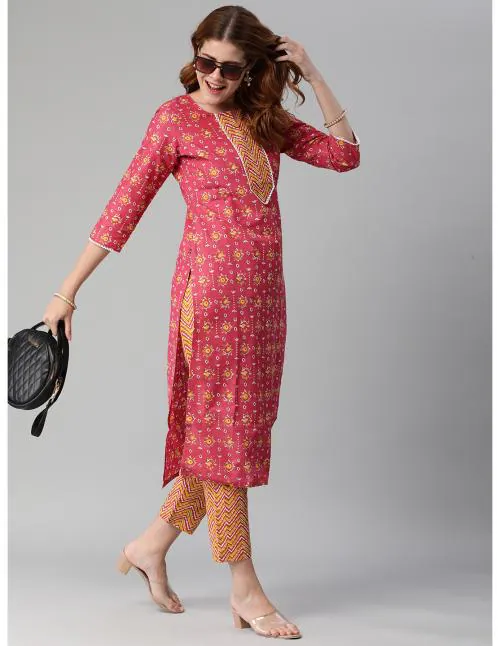 GoSriKi Women's Cotton Blend Pink Straight Printed Kurta with Trouser