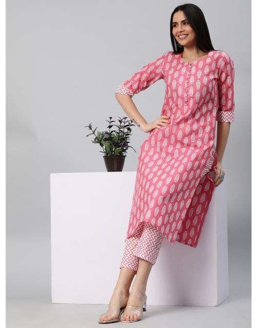 GoSriKi Women's Cotton Blend Pink Straight Printed Kurta with Trouser
