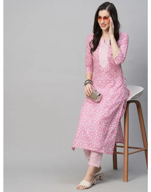 GoSriKi Women's Cotton Blend Pink Straight Printed Kurta with Trousers