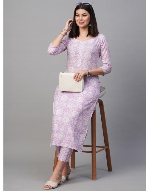GoSriKi Women's Cotton Blend Purple Straight Printed Kurta with Trousers