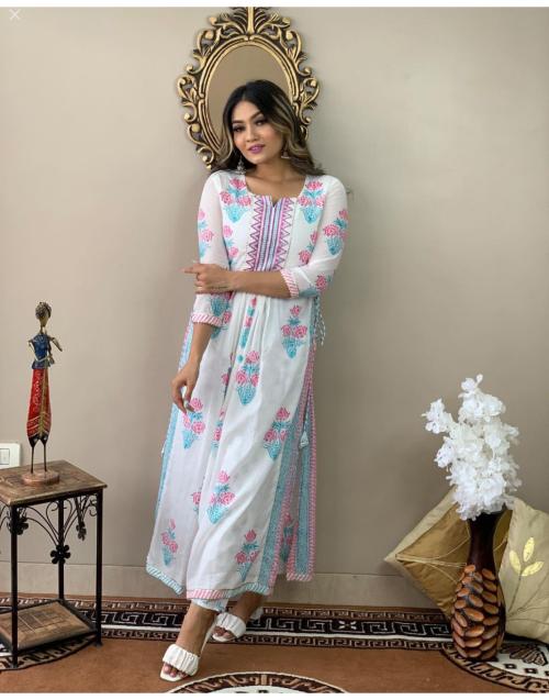 GoSriKi Women White Straight Printed Kurta with Trouser
