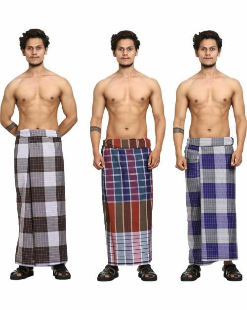 GOWRI TEX Men Multicolor Checkered Pure Cotton Stitched Lungi - Free Size (Pack of 3)