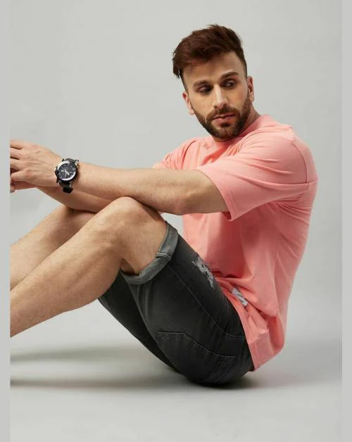 Gritstones Men Coral Half Sleeve Oversized Cotton Solid T-Shirt