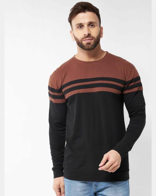 Gritstones Men Moss Brown and Black Color Round Neck Colorblock Cotton T-Shirt