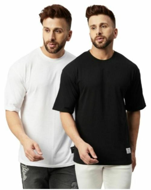 Gritstones Men Oversized White & Black Solid Cotton T-Shirt (Pack of 2)