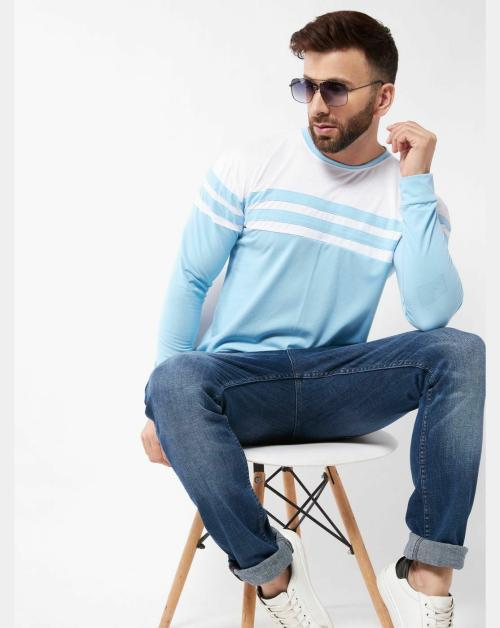 Gritstones Men Sky Blue and White Color Round Neck Colorblock Cotton T-Shirt