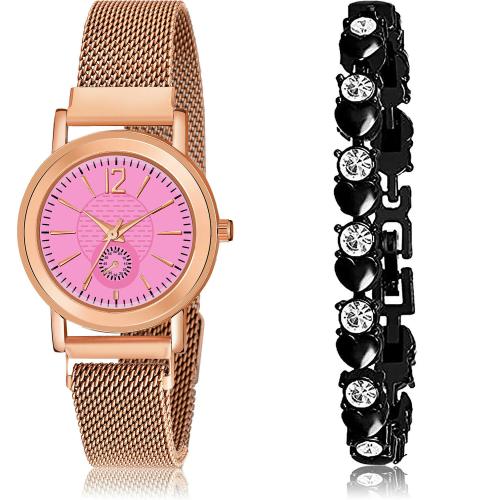 GROOT Best Luxury Magnetic Chain And Bracelet Rose Gold And Black Colour Analog Metal Belt 2 Watch Combo For Women And Girls - GW41-GX10