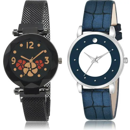 GROOT New Fashion Flower Magnet Chain And Girls Watch Black And Blue Colour Analog Metal And Genuine Leather Belt 2 Watch Combo For Women And Girls - G652-GM340
