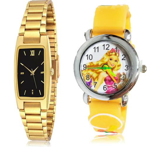 GROOT New Fashionable Golden Couple Chain And Doll Kids Gold And Orange Colour Analog Metal And Plastic Belt 2 Watch Combo For Women And Girls - GCPL34-GC47