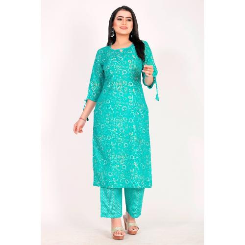 Grubstaker Blue Colour Digital Printed Cotton A Line Cotton Kurti With Pant