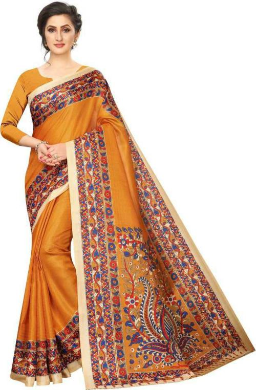 Grubstaker Women Mustard Printed Art Silk Regular Saree