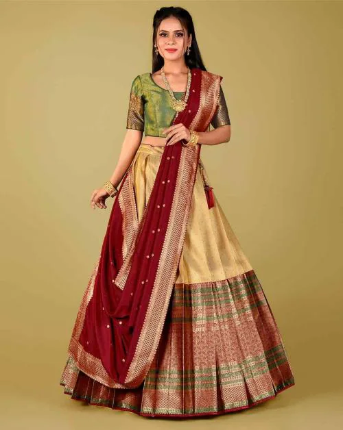 HALFSAREE STUDIO Maroon Banarasi Silk Zari work Semi Stitched Lehenga Choli