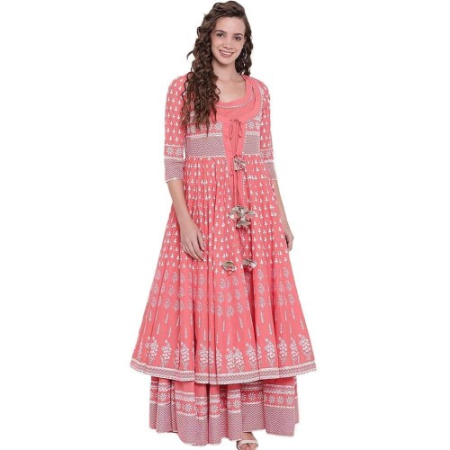 HAMH Peach Coloured Pure Cotton Floor Length Two Piece Dress for Women | M Size