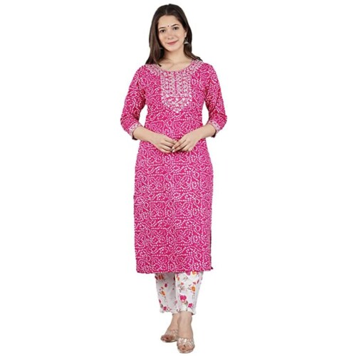 HAMH Women's Rayon Bandhani Printed Kurta and Pants|Pink Printed EMBRODIERED Kurti Set for Women-XL Size