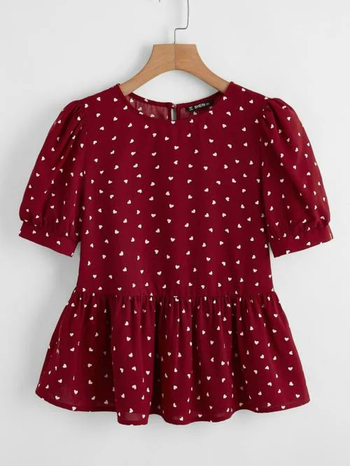 Heart Print Puff Sleeve Peplum Top