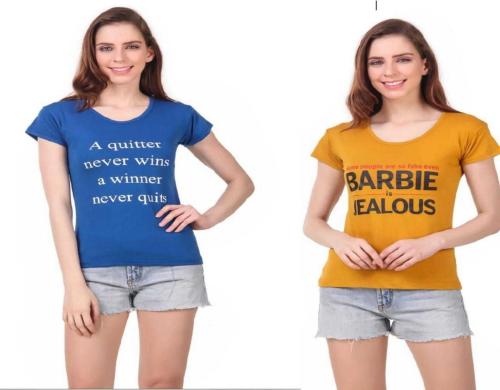 High Seas Women Blue and Yellow Printed Cotton Blend Round Neck T-Shirt - L (pack of 2)