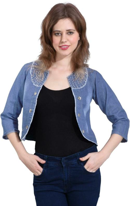 Hrikshika Fashion Women Light Blue Embellished Cotton Lycra Blend Shrug