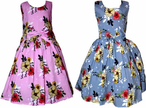 HUNOOR Girls Pink Printed and Grey Printed Floral Print Crepe, Cotton Linen Pack of 2 Fit and Flare Dress