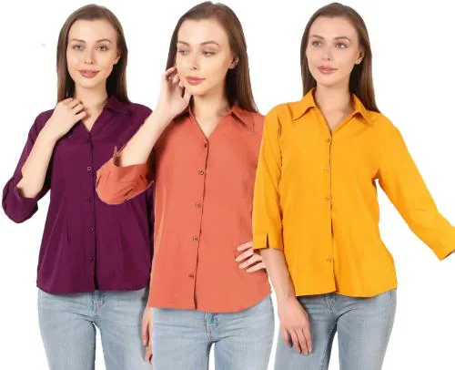 HUNOOR Womens Burgundy, Mustard, Orange Solid Polyester Pack of 3 Casual Shirt l women shirt l casual shirt for women