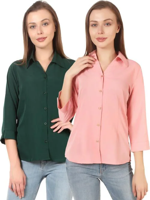 HUNOOR Womens Dark Green and Peach Solid Polyester Pack of 2 Formal Shirt l women shirt l casual shirt for women