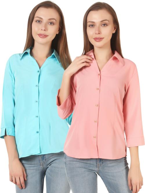 HUNOOR Womens Sea Green and Peach Solid Polyester Pack of 2 Formal Shirt l women shirt l casual shirt for women