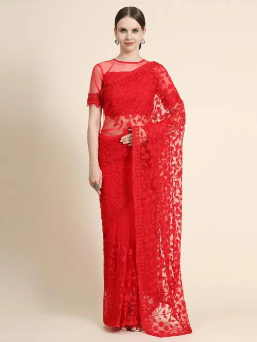 IrisTheStudio Women Red Net Temple Border, Embroidered, Embellished, Floral Print Bollywood Saree - Pr_Revell