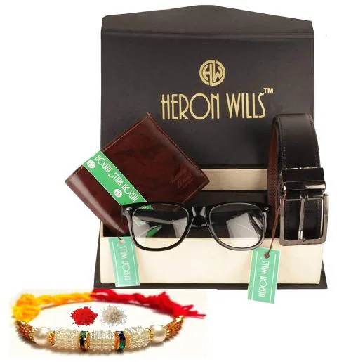 - This 6 pcs combo contain: 2 Designer Rakhi, 1 Rudraksha Rakhi, 1 brown color genuine leather wallet, 1 mens Belt, 1 UV protected Sunglasses