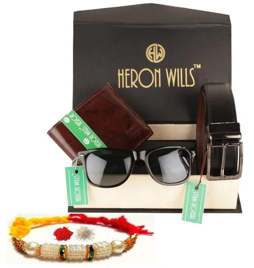 - This 6 pcs combo contain: 2 Designer Rakhi, 1 Rudraksha Rakhi, 1 brown color genuine leather wallet, 1 mens Belt, 1 UV protected Sunglasses