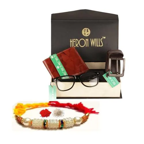 - This 6 pcs combo contain: 2 Designer Rakhi, 1 Rudraksha Rakhi, 1 brown color genuine leather wallet, 1 mens Belt, 1 UV protected Sunglasses