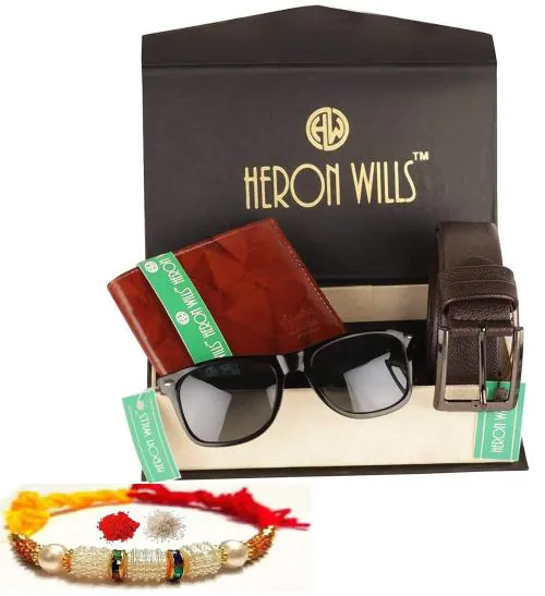 - This 6 pcs combo contain: 2 Designer Rakhi, 1 Rudraksha Rakhi, 1 brown color genuine leather wallet, 1 mens Belt, 1 UV protected Sunglasses