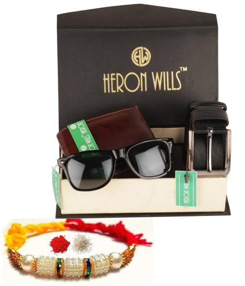 - This 6 pcs combo contain: 2 Designer Rakhi, 1 Rudraksha Rakhi, 1 brown color genuine leather wallet, 1 mens Belt, 1 UV protected Sunglasses