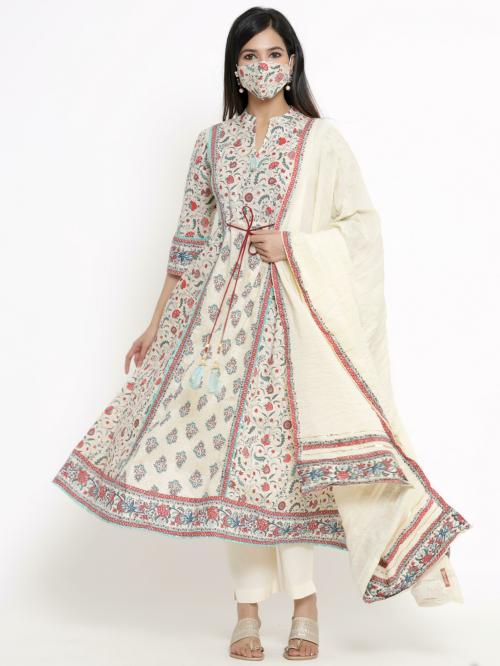 Juniper Women Beige Cambric Printed A-Line Kurta Sets