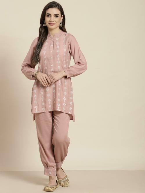 Juniper Women Onionpink Rayon Embroidered Straight Kurta Sets