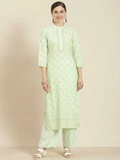 Juniper Women Pistagreen Rayon Printed Straight Kurta Sets