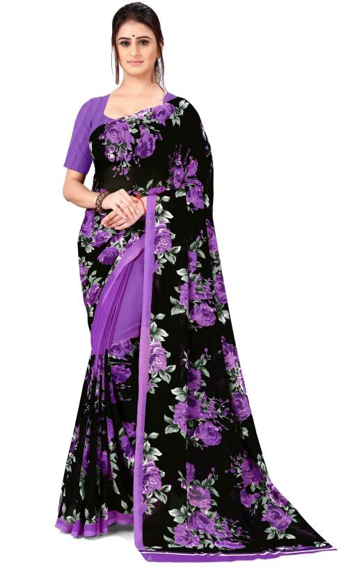 Rooptara Sarees Women Purple, Black Georgette Floral Printed Saree With Blouse Piece