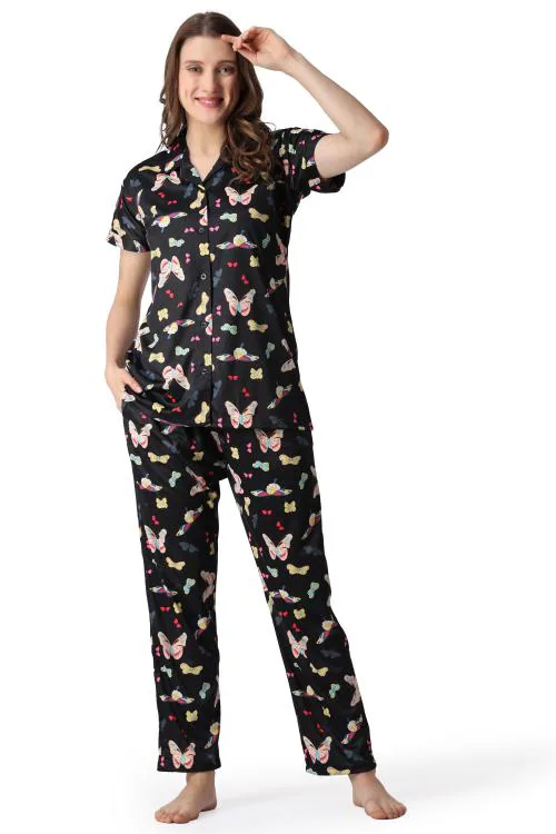 Kawam women Printed Lycra Night Suit Set | Printed Night suit Set for Women | Free Size Lycra Night Shirt and Pajama Set | Black Night Suit