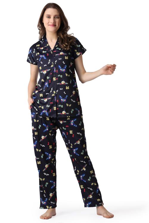 Kawam women Printed Lycra Night Suit Set | Printed Night suit Set for Women | Free Size Lycra Night Shirt and Pajama Set | Blue Night Suit