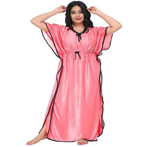 Kawam Women's Satin Night Dress | Solid Maxi Length Kaftan Nighty | Ladies Nightwear - Peach