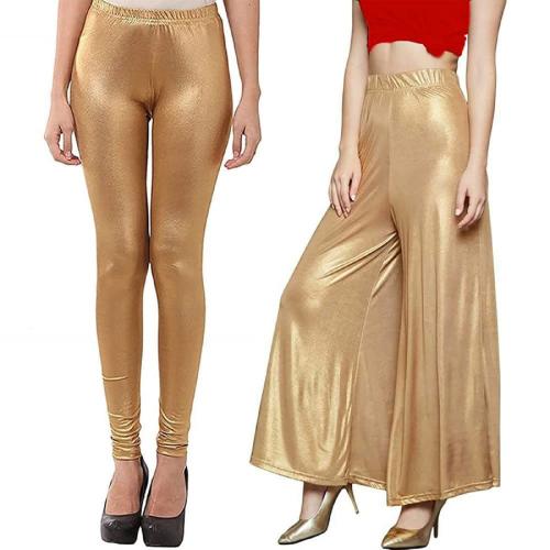KaWam Women's Solid Fully Stitched Readymade Shimmer Golden Palazzo & Legging (Free Size, Pack of 2)